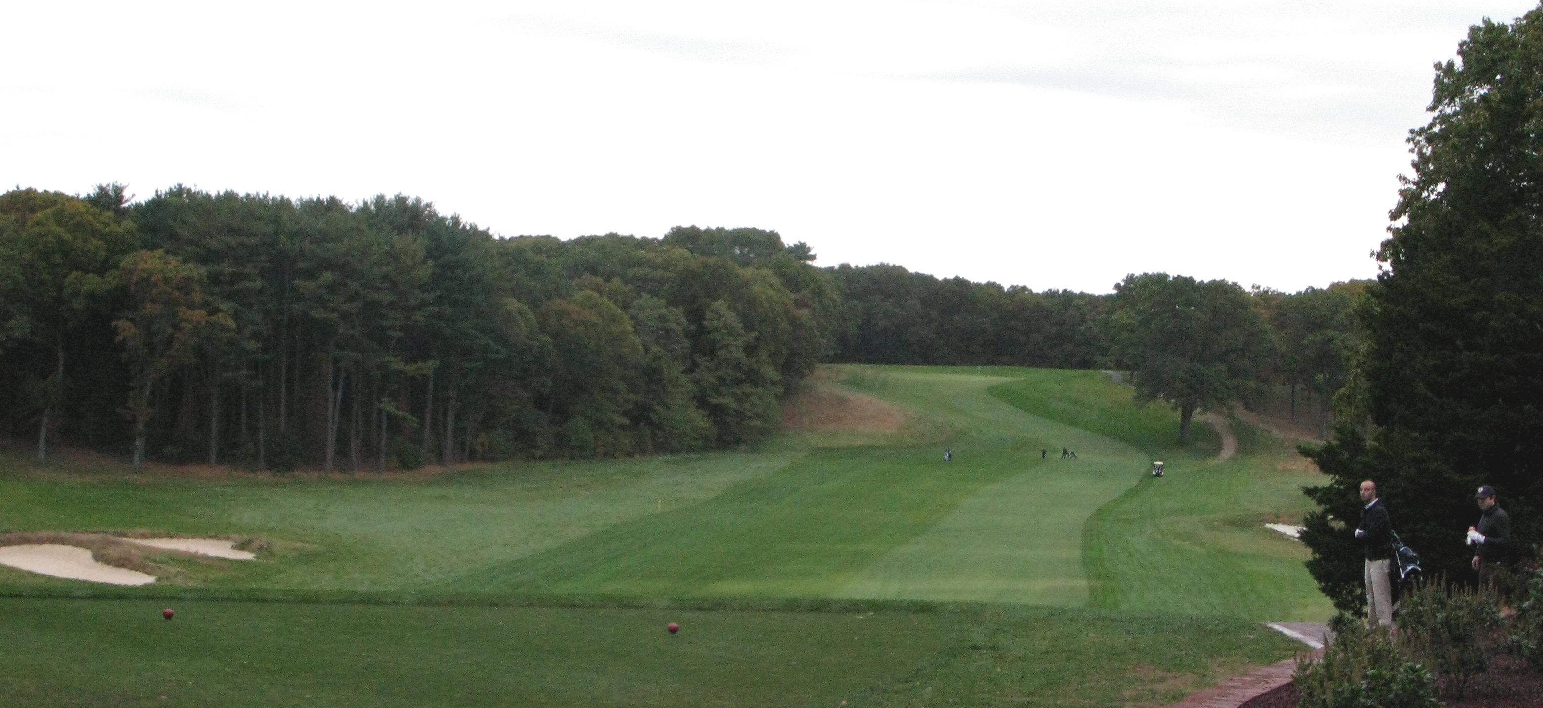 The natural tendency for play from the tee is to split the difference between the base of the exposed shoulder and the lone tree to the right, essentially in the area of the group pictured on the hole above. While not apparent in the above photo, the forward tee obscures a large portion of the fairway from the middle and back tees which serves to further emphasize this strategy. The length of the hole also suggests the golfer should make every effort to ensure as much fairway is usable for a run-on approach to the green on the far ridge.