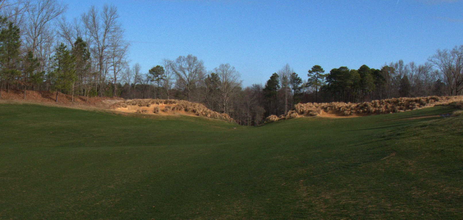 The dramatic features obscure much of the hole from first look. The guardian mounds covered with Lovegrass dominate the view. The peek of fairway through the mounds suggest the hole turns to the left. The narrow pass is achievable with a modest 180-yard shot, and once through, the fairway expands to a comfort forty yard corridor at 230-yards from the tee. A well-struck, longer tee shot will trundle through the fairway if not played toward the left side. A distance of similar length from the tee to the first pinch point must be overcome to carry a second more modest ridge. However, the first-time golfer is left to guess as to what lay beyond. A cut in this ridge serves as a guide setting up the approach to a back-to-front pitched putting green heavily guarded on the right side by three bunkers. Plenty of fairway cut left of the hole allows for aggressive play.
